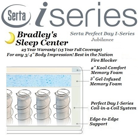 ![]() The Serta Perfect Day I-Series Jubilance features Serta's newest innerspring Duet-Coil technology. This system consists of coils inside of coils which help to maximize both strength as well as motion reduction. For the first time ever, Serta has been able to implement a 25 year warranty for any 3/4" body impression due to the strength of this system as well as a 120 In-Home Trial Guarantee at no extra cost! Also, the I-Series collection features top-of-the-line Gel-Infused Memory Foam for extra conformity and breath-ability. Serta is one of the only companies on the market to use a "Crushed-Gel" process which increases the purity of the gel/memory foam ratio (makes it cooler than other gel-infused beds!) as well as longevity of the foam. Though this crushed-gel process costs more, Serta has shaved production expenses by focusing on local manufacturing facilities (these are made right here in Salt Lake City!) to keep prices low! *Credit must be used towards another purchase - This Credit applies only with the Serta I-Series Collection, and is forfeited if the customer wishes to exchange to a different collection. See stores for details | Current I-Series Flat Top Blow-Out Sale Prices