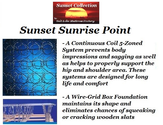 Sunset Mattresses are manufactured by one of the Top Mattress Company in the USA, but not branded to save on costs! Each bed in the Sunset Premium line features a 5-Zoned Continuous Coil System to increase durability in areas that receive the most pressure. With 3" of comfort and support foam layers for extra pressure relief and motion reduction, the Sunrise Point Medium Plush is a great choice for adults needing a little more conformity and a more supportive foam encased edge without breaking the bank.Also, this is the least expensive Continuous Coil Mattress with a foam encased edge that we've seen! This collection carries a full manufacture 10 Year Non-Prorated warranty for any impression measuring over 1 1/2".