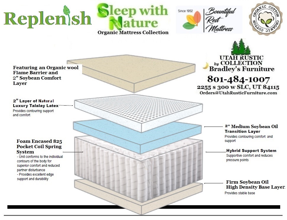 The Replenish mattress is one of our best selling options adults. Available in a Medium Plush Euro Top or Firm option, this gives back, side, and stomach sleepers the unique combination of support and comfort needed to promote deep and healthy sleep patterns. Made locally and with the finest materials available without being outrageously priced, this bed features of 2" of Pure Organic Talalay Latex (1" for the Firm Model), 2" of High Density Soy Based Comfort Foam, and a 2" Transition Layer again made with Soybean Oil which tops the 8" 825 Individually Wrapped Pocketed Coil Spring System for added pressure relief, back alignment, and motion transfer reduction. All of this is wrapped in a Certified Organic Cotton Cover grown without pesticides and spun into a super breathable textile. Finally, we use an organic wool flame barrier layer imbedded in the top cover. In general, we find that latex beds outlast any other type of mattress and tend to be the only product that can last longer than 10 years on the market today. In our opinion, Latex is the best choice for most sleepers because of it's unique ability to distribute pressure equally across the entire body whether you are a back, side, or stomach sleeper and for its breath-ability when compared all other foams.