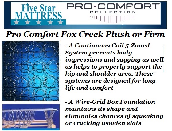 ![]() Five Star Mattresses are manufactured by the Top Mattress Company in the USA, but not branded to save on costs! Each in the Pro Comfort line features a Premium 5-Zoned Continuous Coil System to increase durability in areas that receive the most pressure. Featuring a 3" comfort foam Layer for extra pressure relief and motion reduction, the Fox Creek is a great choice for back or side sleeping adults needing a little more conformity and a more supportive foam encased edge without breaking the bank. Also, this is the least expensive Continuous Coil Mattress with a foam encased edge! This collection carries a full manufacture 10 Year Non-Prorated warranty for any impression measuring over 1 1/2". ![]() | Current Showroom Sale Prices (Print off this coupon and bring it in to the store for instant savings!)