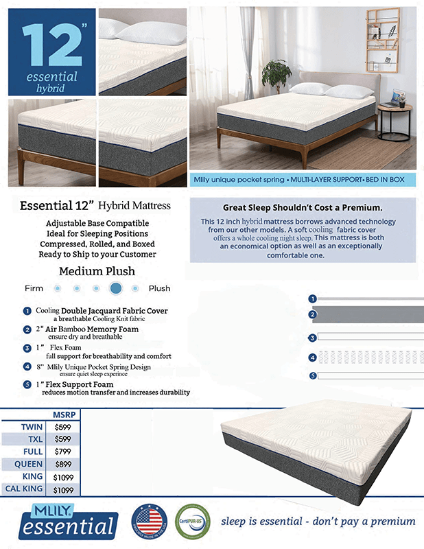 MLily's new Essential features 12" of the latest technology used in similar name brand company's "$3000 Premium Models" for a fraction of the cost! We start off with our patented Bamboo Air memory foam directly under a double jacquard cooling cover. Another 1" layer of support foam is laid directly over the coils to reduce motion. Following 8" of an advance pocket spring system designed for support and buoyancy is a final layer premium high-density foam.