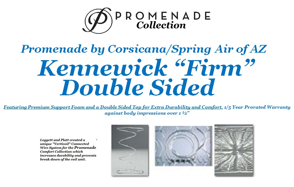 The Promenade Kennewick Double Sided "Firm" Mattress offers a throwback to an older generation where mattress companies produced double sided covers with customer's and longevity in mind. These mattresses when rotated and flipped correctly and frequently throughout their life can yield upwards of 15 years for standard weight sleepers. While Serta is another brand that offers double sided "Hotel" mattresses, the prices from the Promenade Collection are less than half for a similar feel. A Connected Coil "Verti-Coil" Middle by Leggett and Platt helps to prevent body impressions for many years. It is Manufactured by Corsicana under a partnership with Spring Air to help save costs for our customers. We recommend this set for young adults or guest room scenarios for those who prefer a medium top with a supportive core.