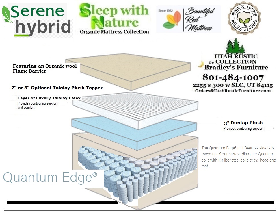 The Serene Series contains no synthetic foams and is at the center of our "clean sleep at a great price" philosophy. Featuring pure organic Talalay and Dunlop latex, Organic Cotton and Wool Blend Flame Retardant and covers (avail. without wool if you're allergic), and a Quantum Edge Pocket Spring system for durability and responsiveness, this mattress is sure to please. Available in a ultra plush Euro Top option and even available with customizable foam inside if you prefer a fimer feel, this gives back, side, and stomach sleepers the unique combination of support and comfort needed to promote deep and healthy sleep patterns. Made locally here in Salt Lake City and with a 20 year best-in-class warranty. In general, we find that latex beds outlast any other type of mattress and tend to be the only product that can last longer than 10 years on the market today. In our opinion, Latex is the best choice for most sleepers because of it's unique ability to distribute pressure equally across the entire body whether you are a back, side, or stomach sleeper and for its breath-ability when compared all other foams.