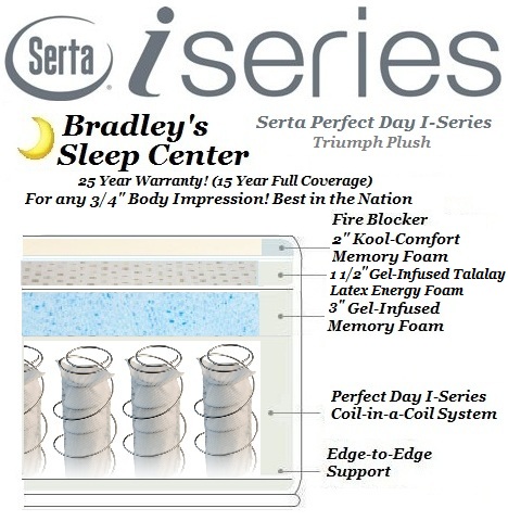 The Serta Perfect Day I-Series Triumph features Serta's newest innerspring Duet-Coil technology. This system consists of coils inside of coils which help to maximize both strength as well as motion reduction. For the first time ever, Serta has been able to implement a 25 year warranty for any 3/4" body impression due to the strength of this system as well as a 120 In-Home Trial Guarantee at no extra cost!
