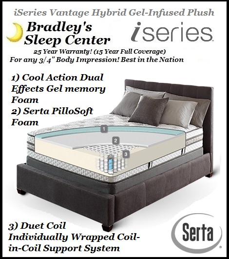 ![]() The Serta I-Series Vantage Plush (Special order in Firm) features Serta's newest Cool-Action Dual Effects Gel-Infused memory foam containing both support and gel beads to help you stay cooler during summer yet warmer during winter. This innovative features ensure a consistent feel through every season in addition to the best pressure relief available on the market thanks to its innerspring Duet-Coil Spring System. This system consists of coils inside of coils which help to maximize both strength as well as motion reduction. For the first time ever, Serta has implemented a free of cost 120 In-Home Trial Guarantee. This exchange program lets you change firmness or even collections within four months to ensure you love your new sleep! The Vantage is the replacement model to the 2013 iSeries Applause - the #1 rated consumer reports mattress for quality, price, and comfort. Also, Serta is one of the only companies on the market to use this Dual Crushed Gel process which increases the purity of the gel/memory foam ratio. Though this crushed-gel process costs more, Serta has shaved production expenses by focusing on local manufacturing facilities (these are made right here in Salt Lake City!) to keep prices low! This is one of Bradley's Staff's recommended mattresses for a master suite bedroom set. | Current Close-Out Sale Prices