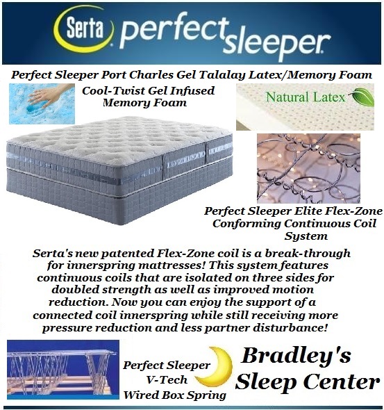 The Serta Perfect Sleeper Elite Port Charles Plush Mattress by Serta combines the top two space age foams into one mattress giving benefits from each. With 1/2" layer of Gel Infused Latex and a 1/2" layer of Gel-Twist Infused Memory Foam, the Port Charles gives exceptional breath-ability and conformity. Also, Serta's "Smart Surface" Cool-Gel Knit Top ensures excellent temperature transfer away from your body. This mattress carries a 10 year non-prorated warranty for any impressions measuring 1 1/2" or more. The Flex-Zone coil is a breakthrough design that features a continual wire for strength, yet reduces motion by adding increased flex. This mattress is great for side and back sleepers that may have back problems or are simply looking for a more comfortable sleep.
