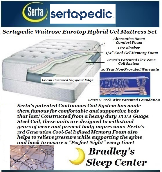The Sertapedic Waitrose Eurotop Mattress is Serta's least expensive Eurotop Set that features Foam Encased Edges and their patented continuous coil system. Its 1/2" layer of Serta's Cool-Twist Gel Memory Foam ensures great conformity and breath ability while still providing a premium continuous coil support for longevity unlike other collections on the market. The Flex-Zone coil helps distribute presser and reduce motion while still maintaining a flat and supportive surface over the years. Serta's Gel Memory Foam adjusts to each sleeper's unique body type, is heat resistant, and prevents motion transfer. This bed would be a great choice for side and back sleeping adults or those who prefer a softer surface feel with a more supportive core. On sale and display now at Bradley's Sleep!