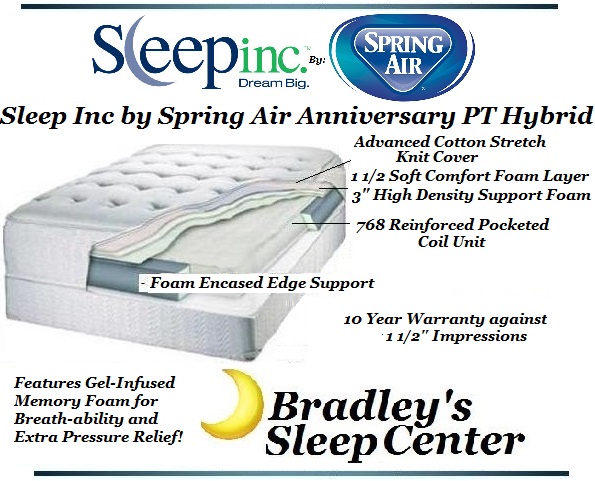 Sleep Inc Anniversary Pillow Top Mattress features individually wrapped pocketed coils and a foam encased edge giving a super cloud-like surface and supportive feel designed with Side and Back sleepers in mind. A Zoned and Reinforced Middle with Gel-Infused Memory Foam ensures comfort while helping to reduce sagging during the 10 Year Limited Warranty. It is Manufactured by Corsicana under a partnership with Spring Air/Sleep Inc. The Anniversary is a great low cost option for teenagers or adults needing a few good years of sleep without killing your back or your bank account!