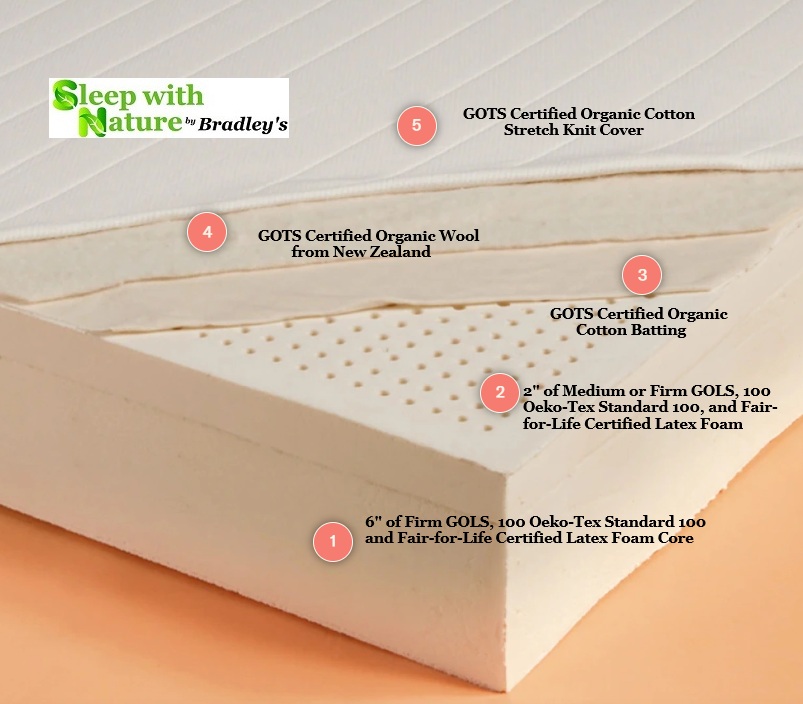 - GOLS/GOTS Organic and Fair-for-Life Oeko-Tex Standard 100 Latex, Wool, and Cotton