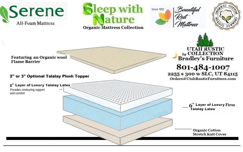 The Serene Series contains no synthetic foams and is at the center of our "clean sleep at a great price" philosophy. Featuring pure 100% Natural Talalay latex, Organic Cotton and Wool Blend Flame Retardant and covers (avail. without wool if you're allergic), this mattress is sure to please. Also available in a 11" Plush option and even available with customizable foam inside if you prefer a firmer feel than this offers which we consider to be close to a 8 of 10 with 10 being the firmest. Made locally here in Salt Lake City and with a 20 year best-in-class warranty. In general, we find that latex beds outlast any other type of mattress and tend to be the only product that can last longer than 10 years on the market today. In our opinion, Latex is the best choice for most sleepers because of it's unique ability to distribute pressure equally across the entire body whether you are a back, side, or stomach sleeper and for its breath-ability when compared all other foams.
