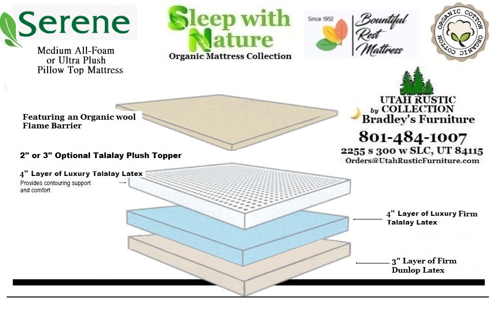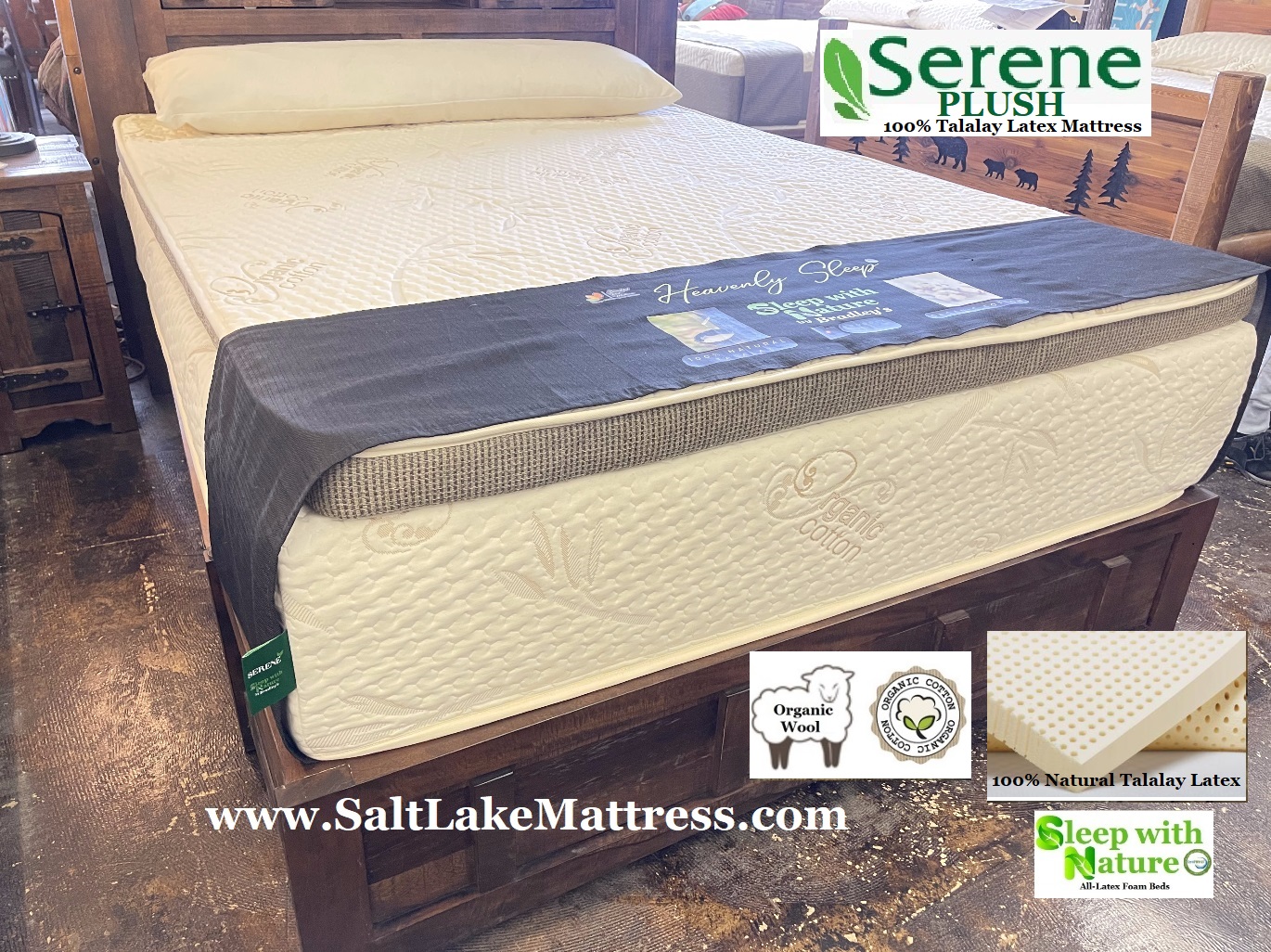 The Sleep with Nature Serene Latex All-Foam bed is one of our favorite mattresses on our showroom featuring 100% All-Natural Latex Foam and is one of our most recommended mattress for all types and sizes of sleepers. Made locally and with the finest materials available, this bed features 100% Natural Talalay and optional USDA Organic Dunlop Latex and an organic wool and cotton fabric barrier. Finally, we use an organic wool flame barrier layer surrounding the foam for humidity reduction and safety. In general, we find that latex beds outlast any other type of mattress and tend to be the only product that can last longer than 10 years on the market today. In our opinion, Latex is the best choice for most sleepers because of it's unique ability to distribute pressure equally across the entire body whether you are a back, side, or stomach sleeper and for its breath-ability when compared all other foams.